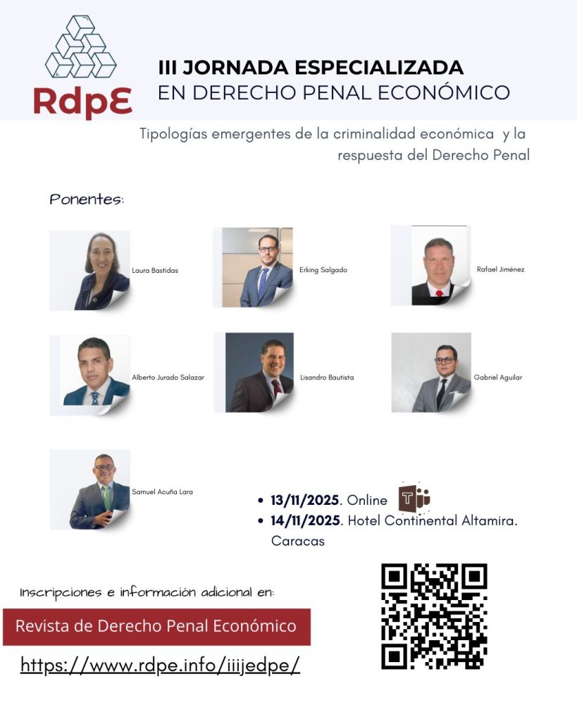 Me complace anunciar mi participación como ponente en la III Jornada Especializada en Derecho Penal Económico, a celebrarse los días jueves 13 y viernes 14 de noviembre de 2025, en modalidad virtual y presencial, respectivamente.